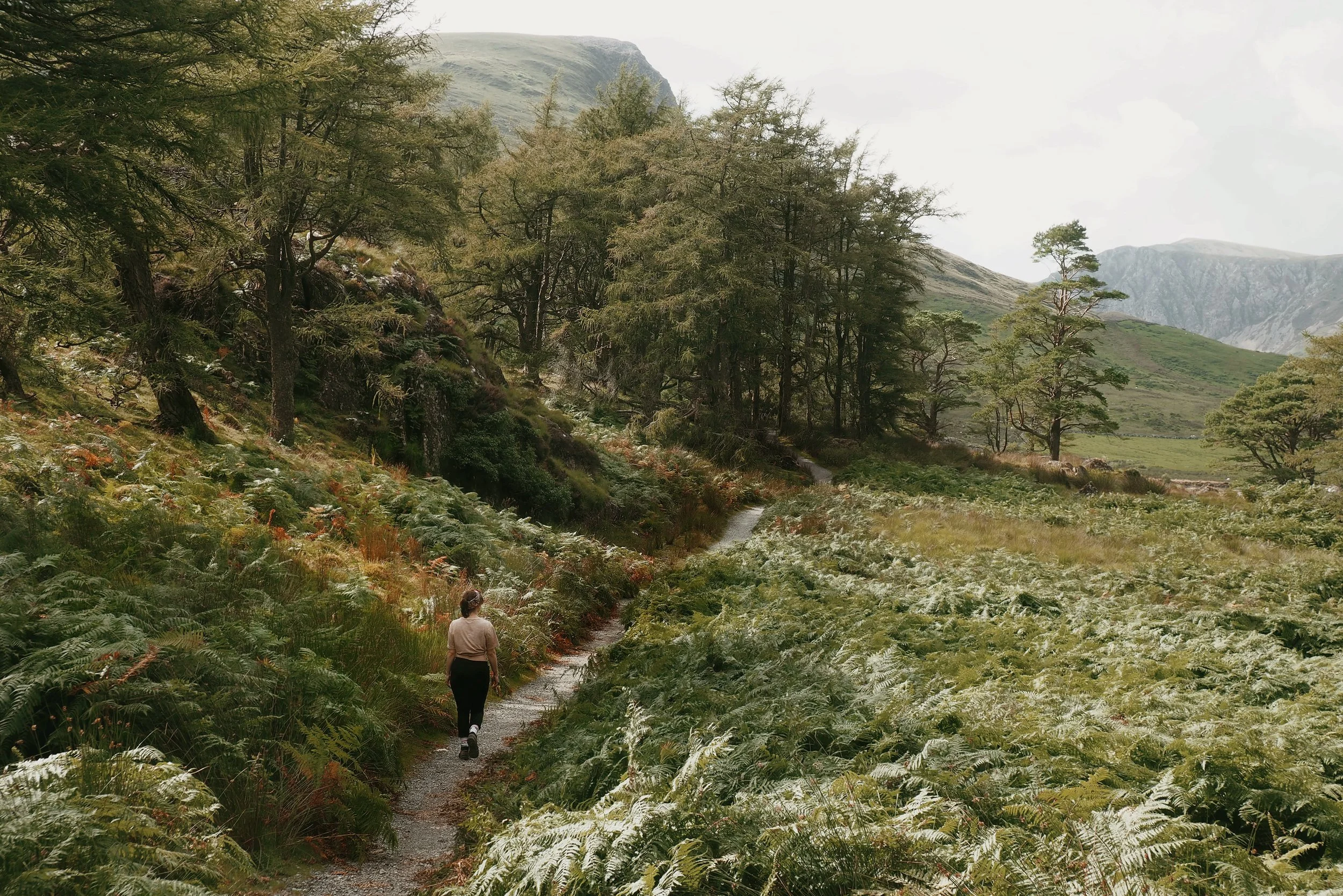 The trail first climbs through scrubbed land covered in large ferns and rowan, hawthorn and apple trees. Swifts are overhead and Wagtails are seen between the trees reminding you that you are near the Afon Glaslyn still, even as you climb toward mountains so high.
