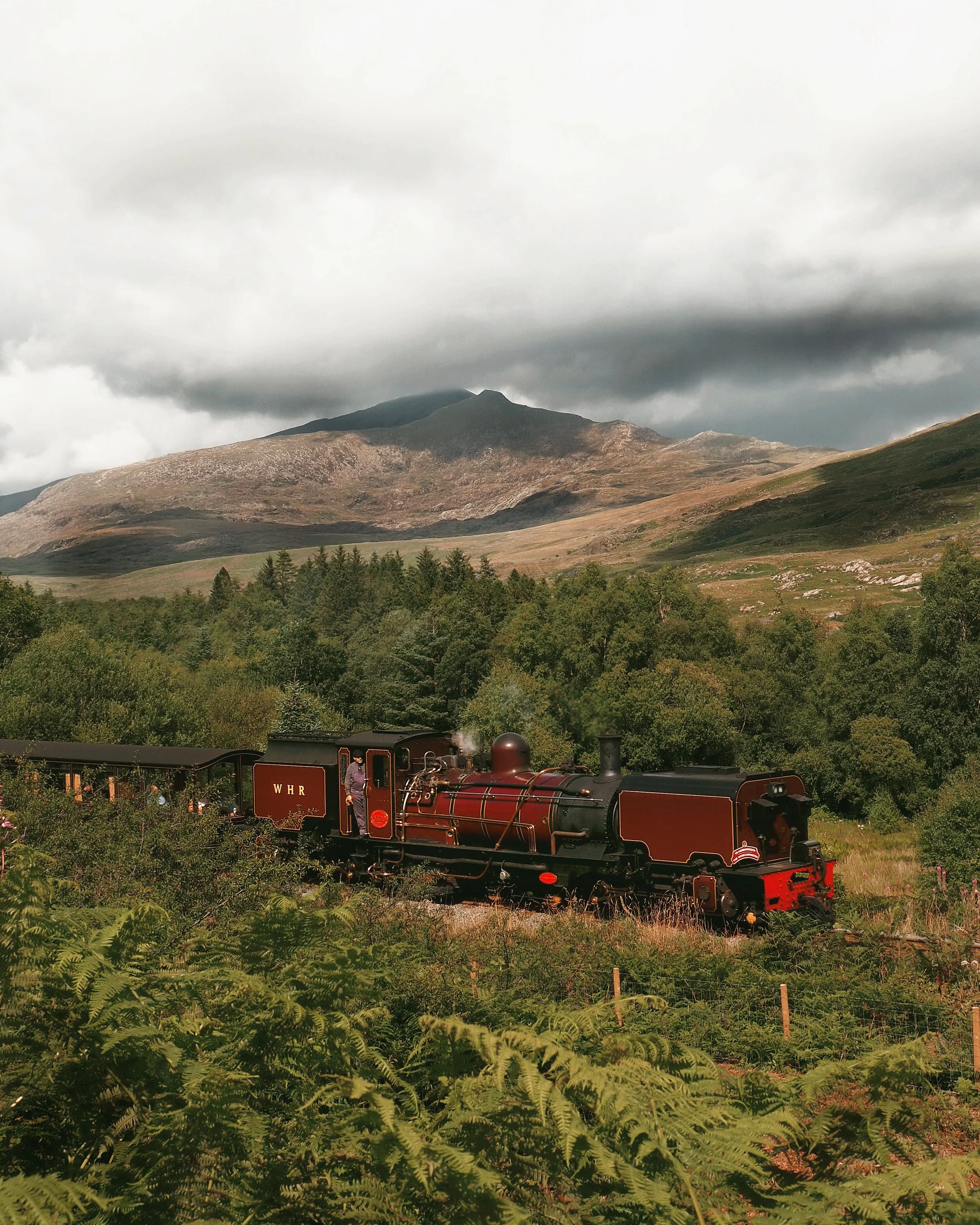 After a while we were greeted with an aspect like no other. The Welsh Highland Railway cut through the trees and we entered another open landscape. The hedgerows filled with ferns, blackberries and sloe allowing us fleeting views of what lay ahead. Yr Wyddfa sat in our path. Towering high, proud looking and dominant. Grey clouds circled above it making it appear gloomy when everywhere else was bathed in sunshine. As we searched for gaps in the hedgerows to see our eyes conquest, the hedge bit back, spiking our legs with thorn and stick. A train then could be heard in the distance, or was it close? It was difficult to judge as it echoed around the mountains which now surrounded us like we were the last pawn on a chessboard, with the pieces closing in. The dark clouds continued to roll and envelop Yr Wyddfa until there was no more and only its stark outline against the blue sky was before us. A train burst into view, deep red and gold with that smell like no other. Pounding metal and boiling oil was showing us tremendous power, but fell short against the authority of the mountain. What a combination. We had been blessed by Eryri again.